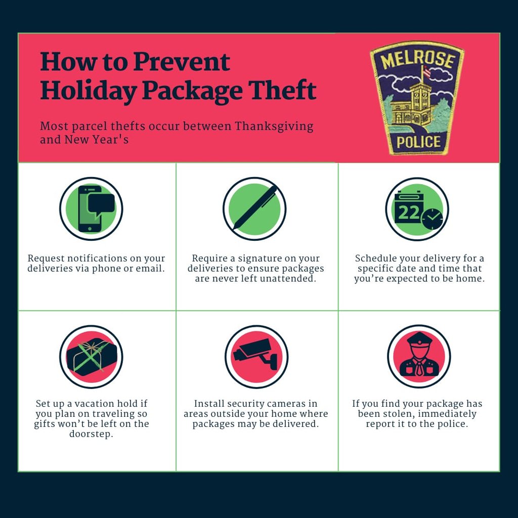 With the holiday season fast approaching and more people shopping for gifts, the Melrose Police Department would like to provide tips to prevent theft for residents expecting package deliveries in the coming weeks.
